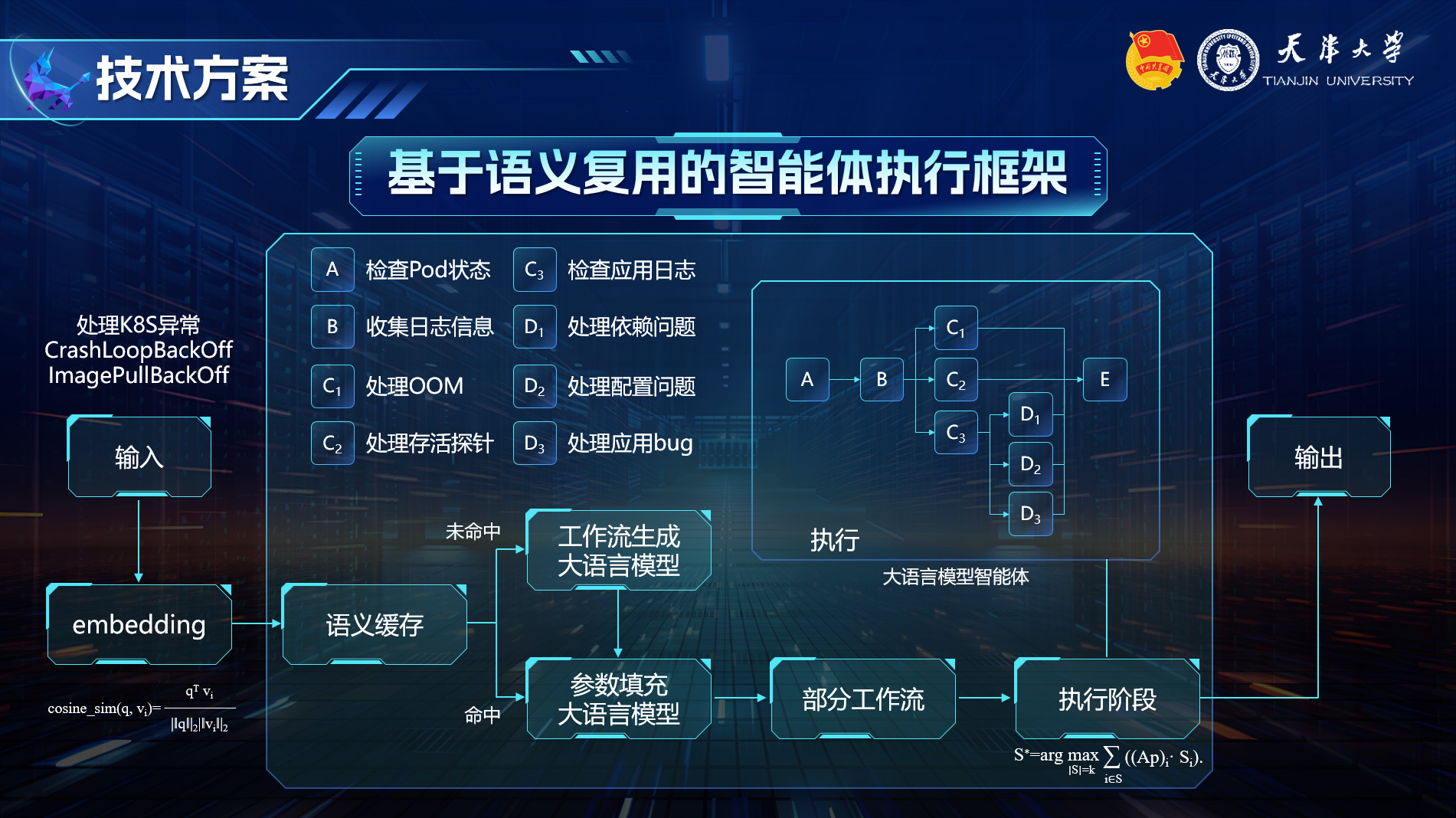 智算学部2024级硕士生陈奕池作为项目队长,带领温路航、张宇杭、温梓昕、王彦博、汪楠筝、朱亚楠、刘启为、苏元楷和宋伊健对麒麟软件公司提出的系统难题进行了仔细分析,主要针对银河麒麟操作系统人工运维存在的运维成本高、异常识别难、故障反馈慢三大核心问题,创新地研制了多层次协同的运维智能体:在系统层,提出卡内流水线并行方案,对不同特征的算子进行卡内混布提升吞吐量,降低运维成本;在应用层,提出多源溯因主动异常检测,通过精准采集系统数据、机器学习异常识别与异常模式聚类,精准高效识别异常;在框架层,提出基于语义复用的智能体执行框架,依托语义识别与工作流缓存机制,实现故障秒级探测与修复,远超人工运维效率。项目相关工作已与发榜单位麒麟软件多次深度沟通,计划进一步推进成果落地,为国产操作系统运维智能化发展提供技术支撑。